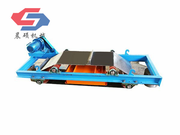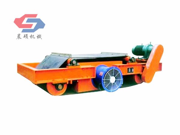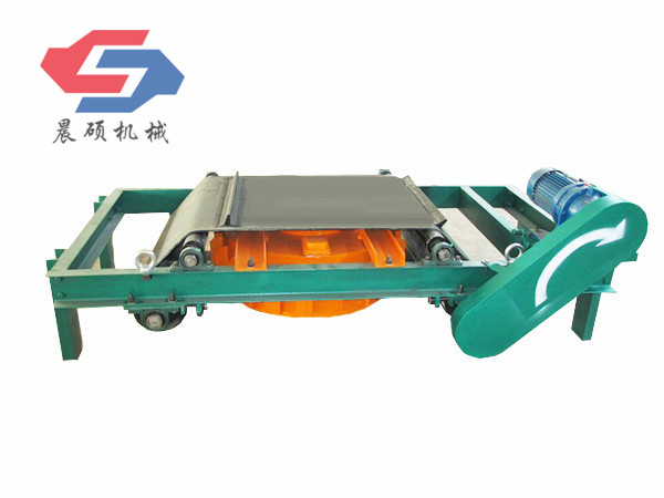電磁除鐵器的基礎(chǔ)上增加了驅(qū)動(dòng)電機(jī)、滾筒、帶刮板的缷鐵膠帶等組成的缷鐵機(jī)構(gòu)。在工作過(guò)程